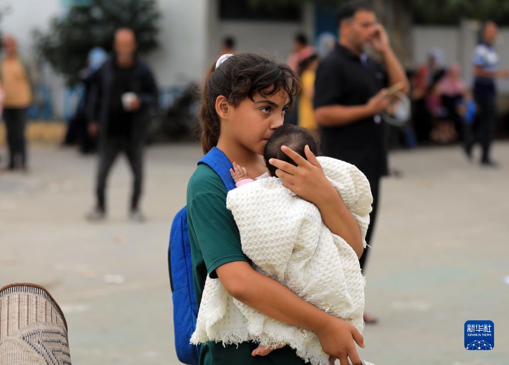 10月9日,一名妇女抱着小孩在加沙地带南部城市汗尤尼斯的一所学校躲避以色列空袭。新华社发(亚西尔·库迪摄)