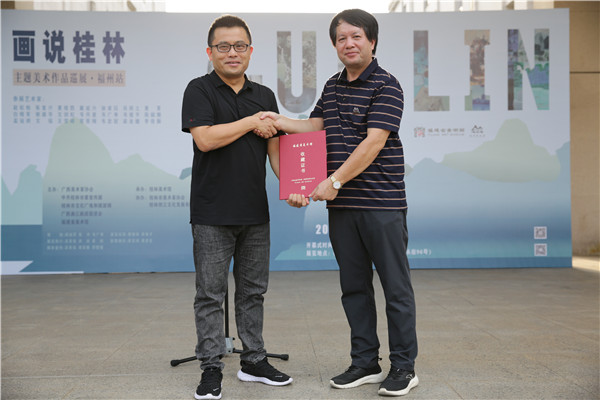 桂林市美术家协会主席、桂林美术馆副馆长韦广寿(右)与福建省美术馆馆长邱志军(左)合影