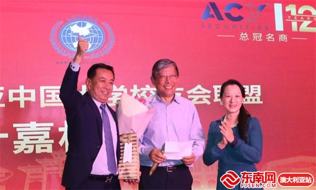 澳洲中国大学校友会联盟第13届主席叶嘉松(中)与澳大利亚中国大学校友会联盟第12届主席宋海悦(右一)送上祝福