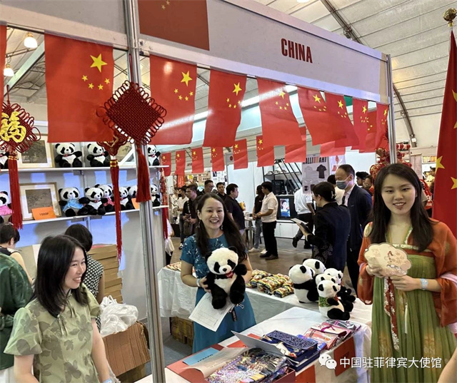 使馆义卖展台高高挂起五星红旗和中国结,分外鲜艳夺目,洋溢着欢快喜庆的“中国风”。展台上,20余种特色商品琳琅满目,有精美的茶具、丝巾、真丝手包、披肩、书签、水墨画框等中国传统工艺品,有美味的中国特色小吃,还有备受年轻一代喜爱的熊猫玩偶。使馆女外交官们身着传统中国服饰汉服和旗袍,端庄大气,十分吸睛。公参王玉磊、参赞黄雅萍亲自带货,与馆员们在现场热情展示中国商品,宣传中华文化。
