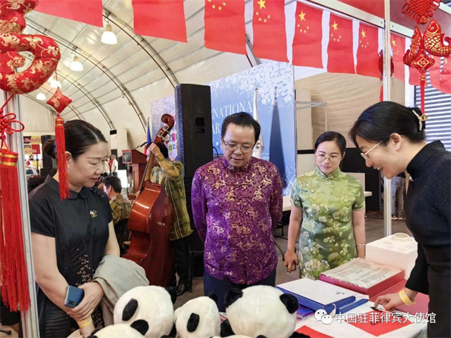 11月19日,菲律宾外交部和国际义卖基金会(IBF)在菲律宾国际会议中心举办2023年度国际慈善义卖活动,菲外长马纳罗夫人帕米拉、大马尼拉地区塔吉格市市长拉妮·卡亚塔诺、各国驻菲使节及夫人等出席。中国驻菲律宾大使黄溪连以及使馆女外交官代表参加。