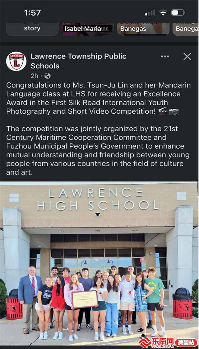 东南网美国11月28日讯(特约记者 刘伟)在首届“丝路”国际青少年摄影、短视频大赛中,美国新泽西州劳伦斯高中(Lawrence High School)与格伦瑞奇高中(Glen Ridge High School)AP学生在比赛中崭露头角。在林纯如老师和张世红老师的积极组织指导下,学生们展现了他们的创意和摄影技巧,两校参赛作品均超过30件,获得组委会颁发的优秀组织奖。除此之外,新泽西中文教师学会的廖山漫、胡林林、秦艳、边芳等多位老师也都积极组织学生参与。