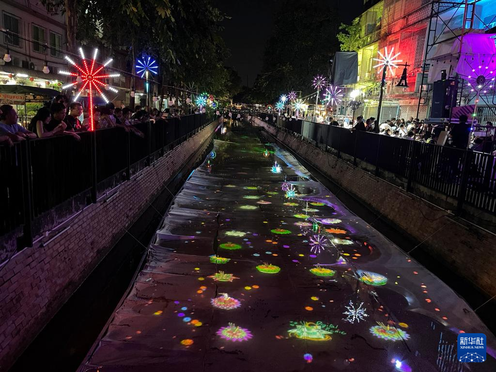 11月27日,色彩斑澜的数字水灯投影到曼谷老城区翁昂运河上。
