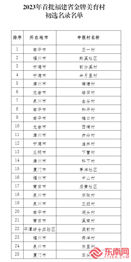 “育见山海”福建省金牌美育村培育工程,是省文化和旅游厅新启动的一项探索性实践项目,通过培育工程积极推动优质美术资源下沉,激发乡村文化创新创造活力,得到了全省各地的积极响应和大力支持。近期,经专家评选出南平市五一村等25个村,入选首批福建省金牌美育村初选名录。省文化和旅游厅将联合各地进行为期一年培育后,“优中选优”推出一批“福建省金牌美育村”。该项目将充分利用福建特色美术资源开展乡村美育普及,积极培育“文旅+”“+文旅”新业态新模式,创新做好文化保护、传承、传播发展“四篇文章”,推进文旅深度融合发展,促进美育赋能乡村振兴,更好满足人民群众日益增长的精神文化需求。