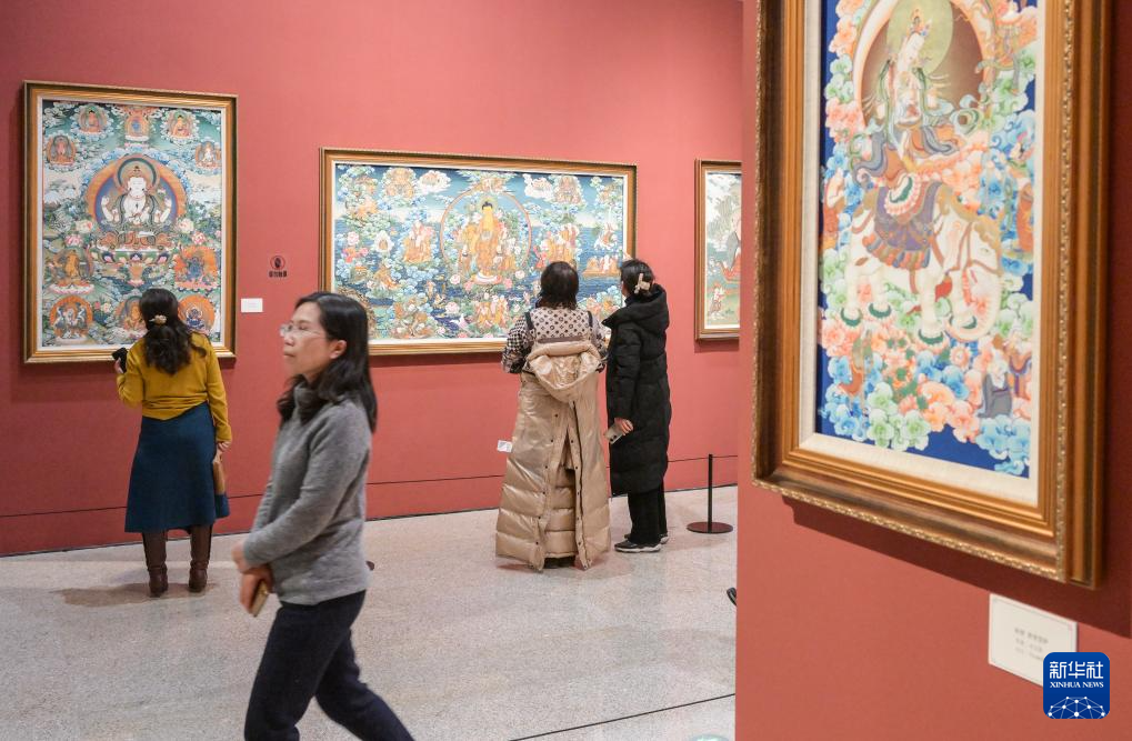 12月27日,一位画师在展览现场展示传统热贡唐卡的绘制工艺。