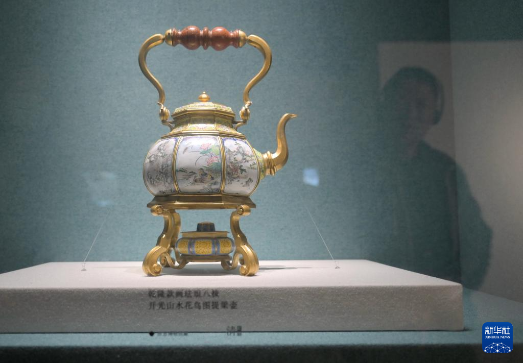 这是12月30日在特展现场拍摄的清代乾隆款画珐琅八棱开光山水花鸟图提梁壶。