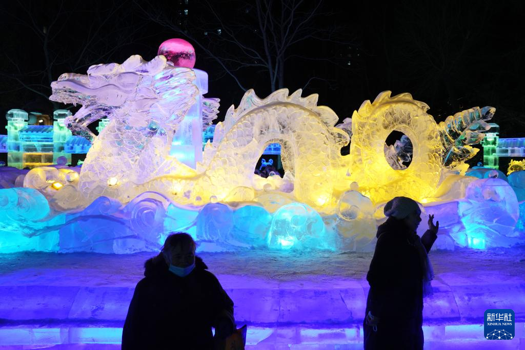 12月31日,游客在哈尔滨冰灯艺术游园会园区内拍照。