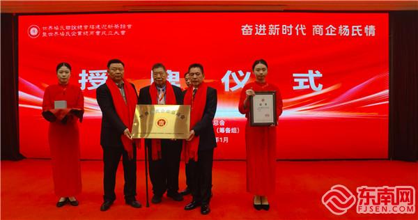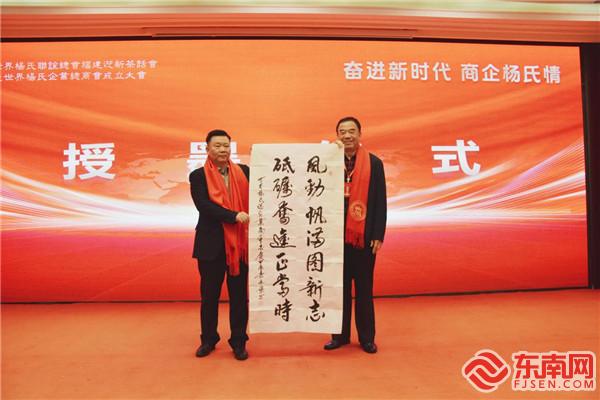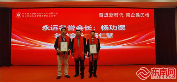 世界杨氏联谊总会永远名誉会长杨功德与第四任会长杨仁慧为世界杨氏企业总商会颁发牌匾与印章以及会长任命书