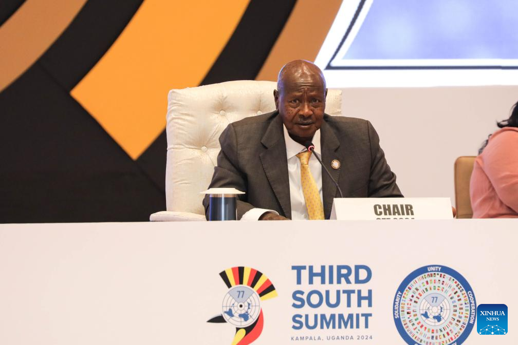 Ugandan President Yoweri Museveni speaks at the Third South Summit in Kampala, Uganda, on Jan. 21, 2024. The Third South Summit ended on Monday in Kampala with participating leaders calling for an immediate ceasefire in the Gaza Strip and the protection of civilians. (Photo by Hajarah Nalwadda/Xinhua)