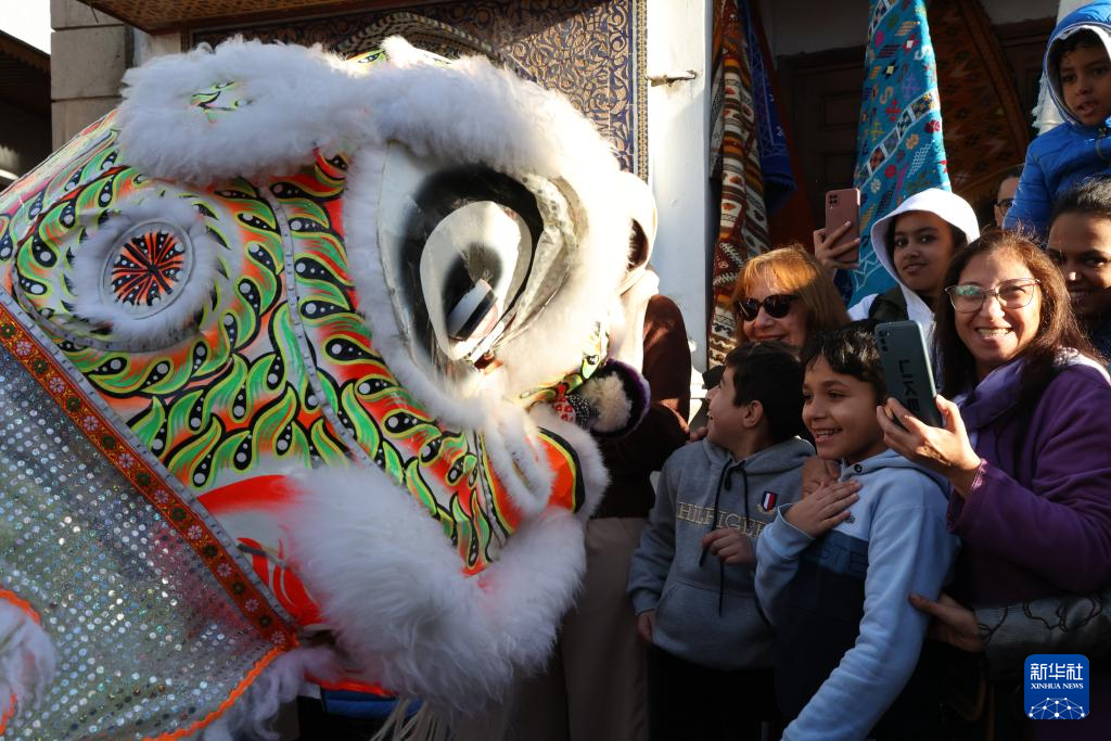 1月22日,人们在摩洛哥首都拉巴特老城里观看舞狮表演。