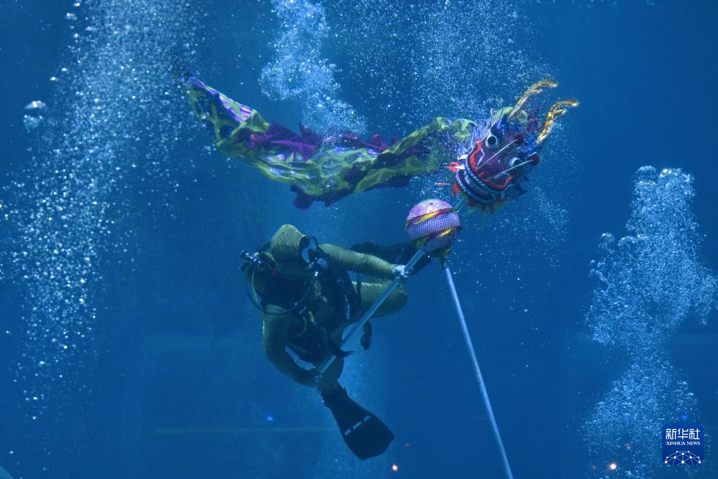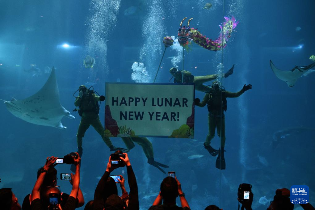1月25日,潜水员在新加坡S.E.A.海洋馆表演水下舞龙,迎接农历新年。新华社发 (邓智炜摄)