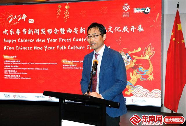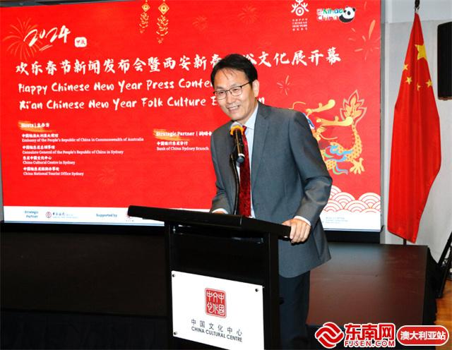 东南网澳大利亚1月26日讯(特约记者 一禾)当地时间1月25日,中国驻澳大利亚大使馆、驻悉尼总领事馆和悉尼中国文化中心联合举办2024龙年“欢乐春节”新闻发布会。由西安市文化和旅游局、悉尼中国文化中心共同主办的“欢乐春节·锦绣长安——2024西安新春民俗文化展”同时在悉尼中国文化中心隆重开幕,拉开全澳“欢乐春节”的序幕。中国驻悉尼总领馆代总领事王春生、中国驻澳大利亚大使馆公使衔参赞肖夏勇、悉尼市副市长郭耀文、澳中友好协会全国会长简·埃弗里特(JAN EVERETTE)、驻悉尼总领馆文化参赞王书羽、悉尼中国文化中心主任兼中国驻悉尼旅游办事处主任刘东、中国银行悉尼分行行长任立等中澳嘉宾和媒体80余人出席发布会暨开幕活动。
