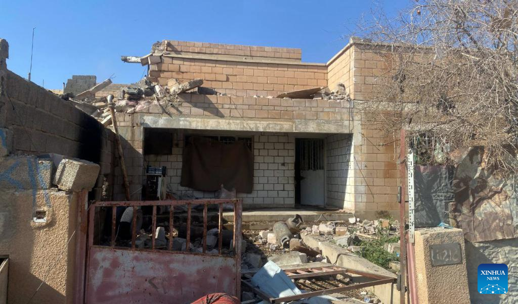 This photo taken with a mobile phone on Feb. 3, 2024 shows a damaged house after U.S. airstrikes in Anbar, Iraq. The Iraqi government said Saturday that the U.S. airstrikes on the paramilitary Hashd Shaabi forces in western Iraq killed 16 people, including civilians, and injured 25 others. (Xinhua)