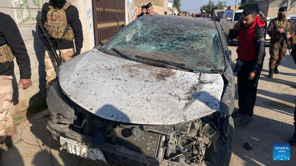 This photo taken with a mobile phone on Feb. 3, 2024 shows a destroyed car after U.S. airstrikes in Anbar, Iraq. The Iraqi government said Saturday that the U.S. airstrikes on the paramilitary Hashd Shaabi forces in western Iraq killed 16 people, including civilians, and injured 25 others. (Xinhua)