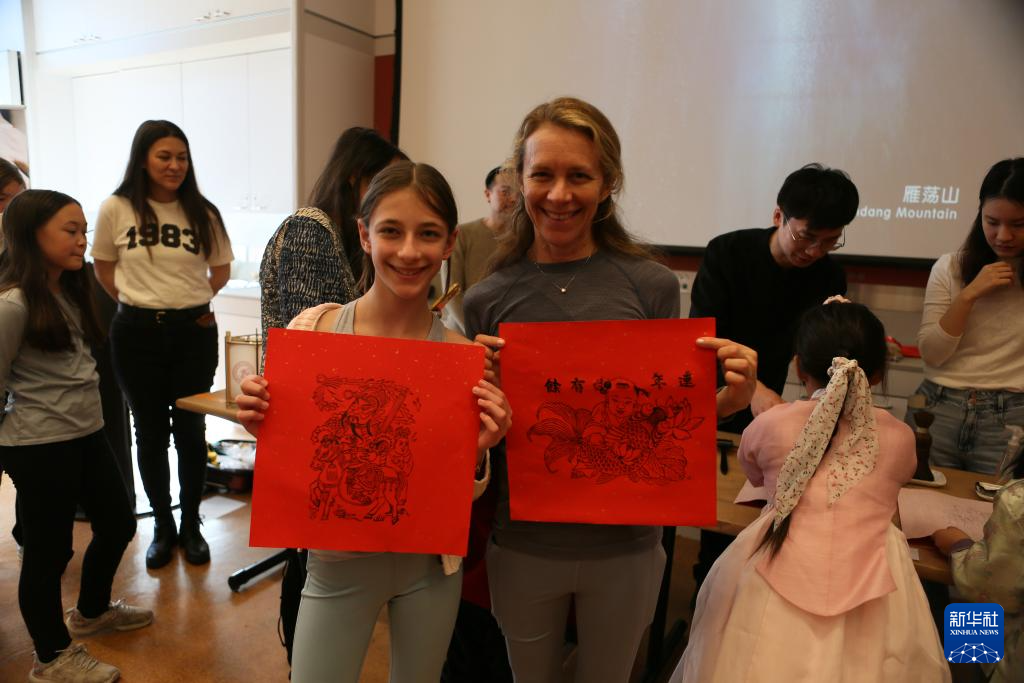2月3日,在美国纽约大都会艺术博物馆,参观者展示自己制作的木版年画作品。