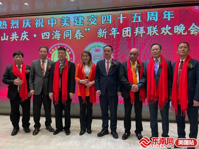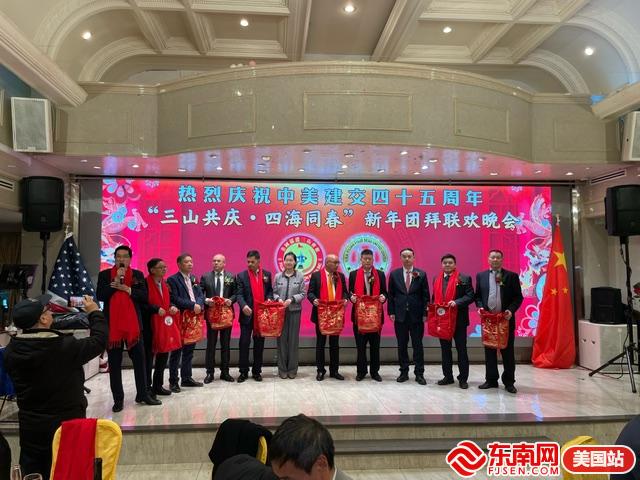 东南网美国2月5日讯(特约记者 纽约墨人)2月3日,美国福建三山会馆与美国福建四海商会在纽约布碌仑海悦大酒楼联合举行“庆祝中美建交45周年暨三山共庆四海同春新年团拜联欢晚会”。中国驻纽约总领事馆领侨处主任潘焱、领事邢玉临与美东侨领侨胞五百多人相聚一起,喜迎新春!