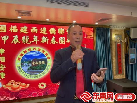 美国福建西边侨联会创会主席杨英在致辞中向各位父老乡亲拜年,祝大家新年快乐、龙年吉祥。他感谢郑修成带领西边侨联会这一届年轻企业家,为家乡各项建设作出贡献,也感谢侨联会创会以来,各位前辈对会务作出的贡献。