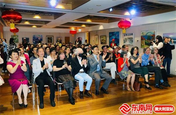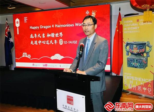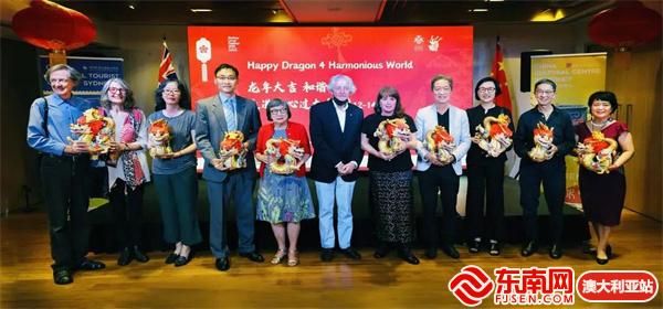 东南网澳大利亚2月13日讯(特约记者 一禾)当地时间2月12日,由澳大利亚新南威尔士州多元文化部资助,悉尼中国文化中心和澳大利亚华人文化遗产学会共同主办的“龙年大吉 和谐世界”——走进中心过大年新春活动在悉尼中国文化中心隆重开幕。澳大利亚华人博物馆主席达芬尼·凯丽(Daphne Lowe Kelly)、驻悉尼总领事馆文化领事王雅梅、新州教育部文化专员克莱尔·唐纳利(Clare Donnelly)、悉尼中国文化中心兼旅游办事处主任刘东、新州多元文化部长代表Simon Chan、澳大利亚华人文化遗产学会主席李惊蛰、澳大利亚水彩画协会主席大卫·范·纽恩(David ven Nunen)、新南威尔士大学艺术学院前院长伊恩·霍华德(Ian Howard)及各界友好人士和媒体80余人出席了开幕式。