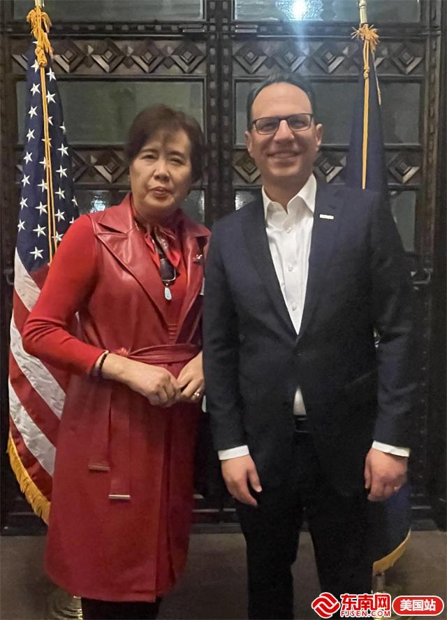 美国宾州州长乔什·夏皮罗和美国费城华人妇女联合会会长林玉金合影留念。
