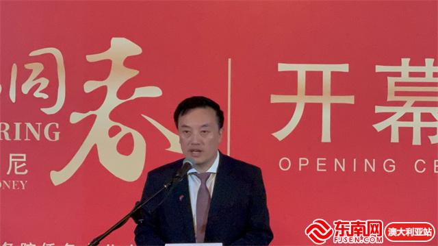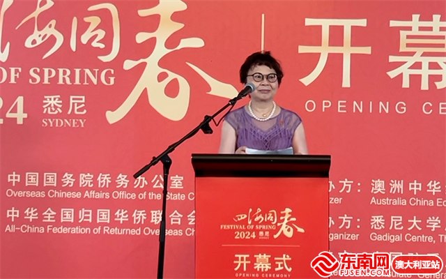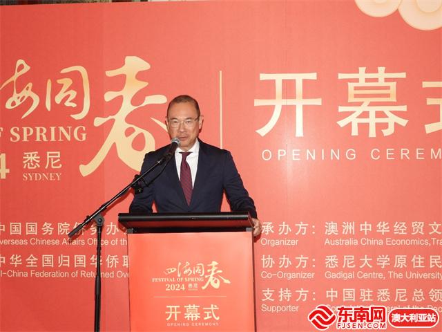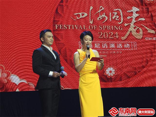 东南网澳大利亚2月24日讯(特约记者 兰木)当地时间2月21日,由中国国务院侨务办公室、中华全国归国华侨联合会主办、由华贸会承办、中国驻悉尼总领馆支持的2024年“四海同春”访演活动在悉尼市政厅隆重上演。中国驻悉尼总领事馆代总领事于杰、四海同春亚太代表团团长张毅、悉尼市副市长郭耀文、新南威尔士州(新州)多元文化部部长代表、新州议会上议员马克·布蒂吉格、澳大利亚中华经贸文化交流促进会(以下简称“华贸会”)主席吴飞鹏、执行主席、“四海同春”悉尼组委会主席曾毅及来自澳洲政界、侨界2000余名观众共同观看了精彩演出。