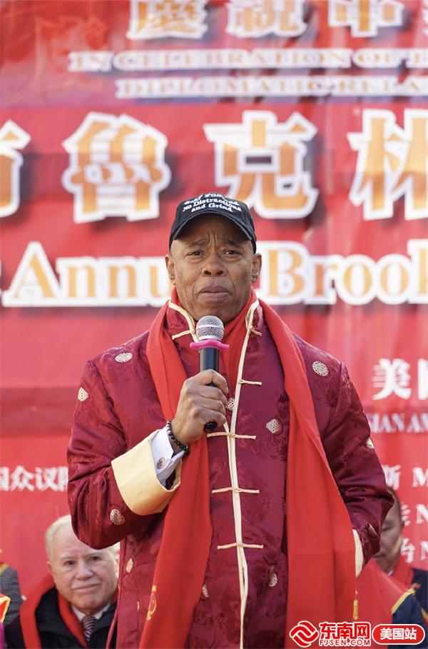 身穿唐装前来的纽约市长亚当斯致辞时表示,布碌仑区拥有全国较大的华人社区,他和纽约市向这个令人惊叹的社区表达支持。今年是创新、繁荣的龙年,他祝愿这个伟大的社区有美好的未来。随后他向亚总会及大会颁奖,感谢所有人为这个活动的付出以及为这座城市所作的贡献。