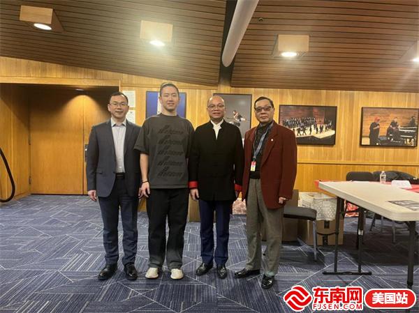 新泽西州立罗格斯大学学联2024春节联欢晚会,中国总领事馆教育参赞余有根(右二)和领事耿俊伟到会支持,左二为学联主席李弘立,右一为大纽约地区福建学生学者联谊会主席刘伟。