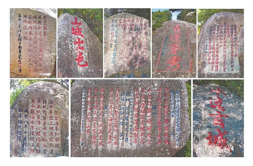 据统计,明代嘉靖、隆庆、万历年间,张元勋、于嵩、刘大勋、蔡潮等驻守海防要塞的武将、文士,纷纷在山间崖石壁上刻诗题词,或吟咏悬钟城的险要和海面的景象,或歌颂平倭寇的快意和功绩,楷、草、行、隶、篆诸体俱全,一共36方。