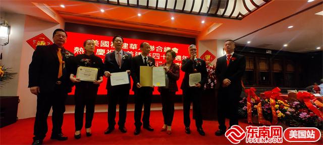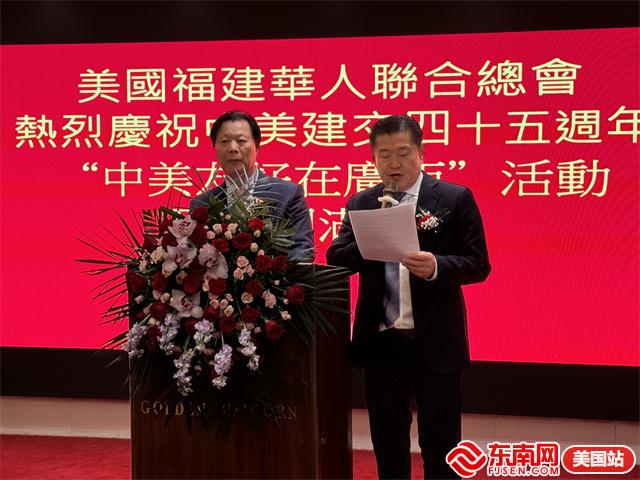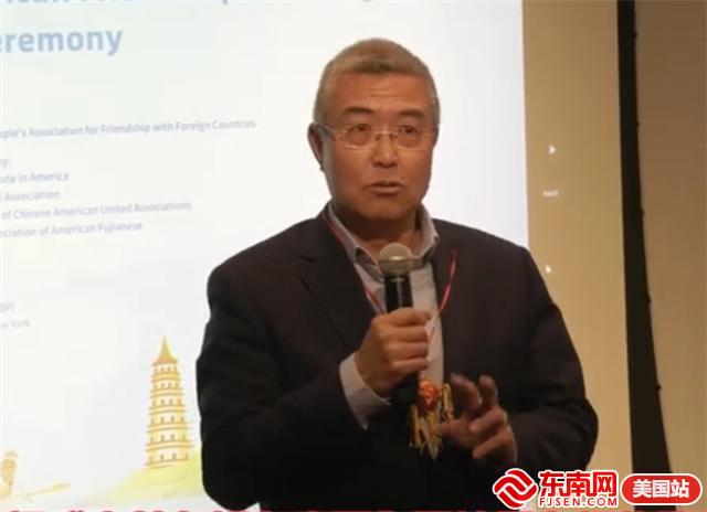 美国福建华人联合总会主席李华(左)致欢迎词