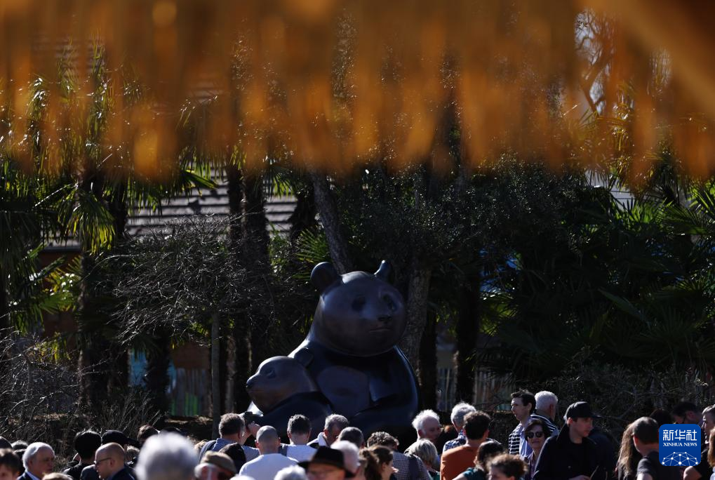 3月22日,在法国中部城市圣艾尼昂的博瓦勒野生动物园举行的揭幕仪式上,人们观看大熊猫雕塑。