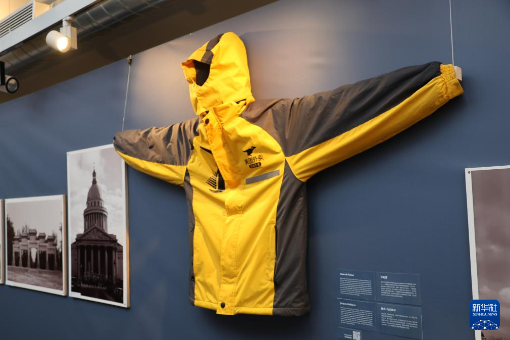 这是3月23日在法国巴黎举办的“甲子情深——中法百姓故事展”上拍摄的法国纪录片导演雅克·马拉泰尔在中国拍摄纪录影片《北京人:人类最后的秘密》期间购置的外卖员制服。