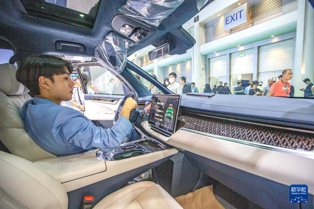 3月27日,一名观众在泰国曼谷国际车展上体验长安深蓝S7汽车。