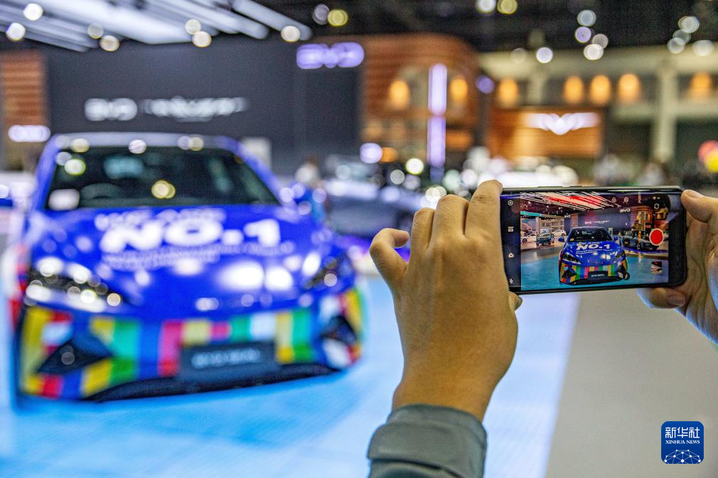 3月27日,一名观众在泰国曼谷国际车展上拍摄比亚迪海豹汽车。