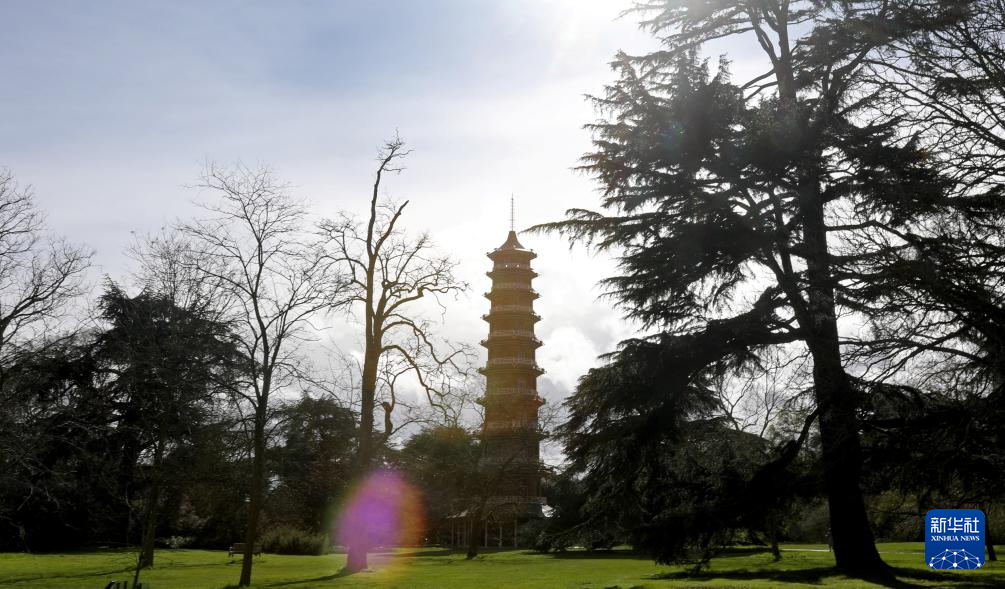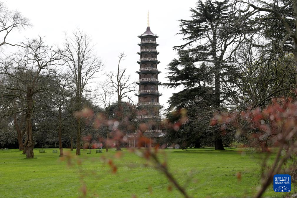 这是3月27日在英国伦敦邱园(英国皇家植物园)拍摄的中式宝塔。