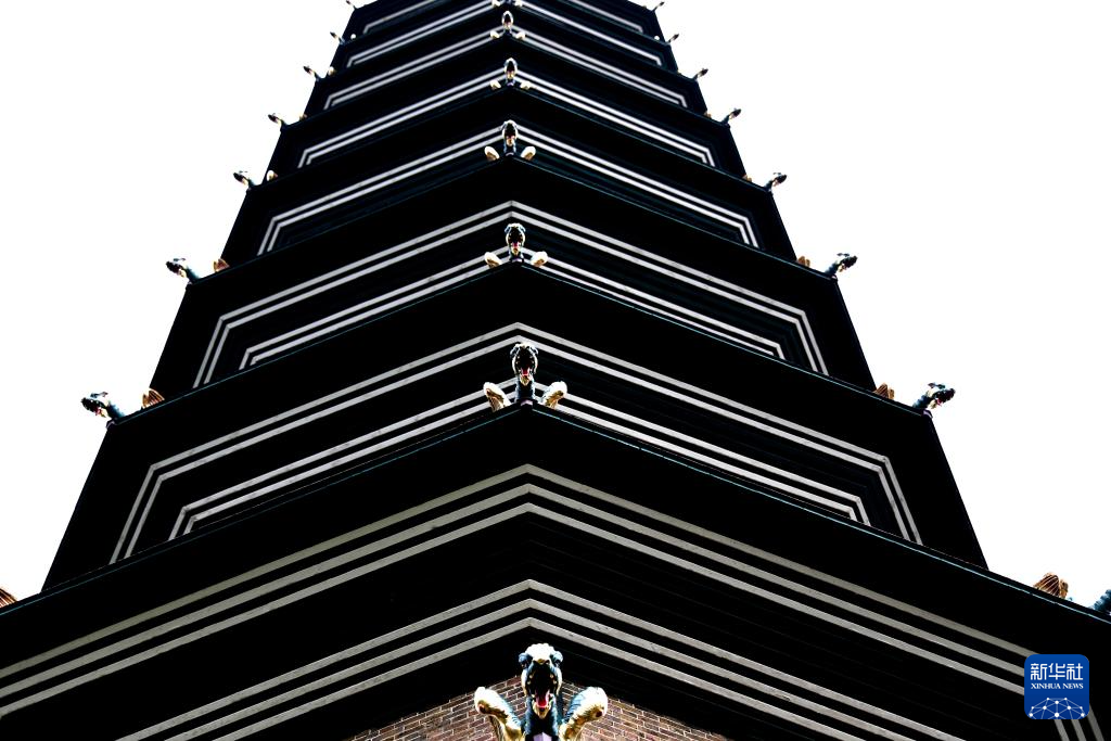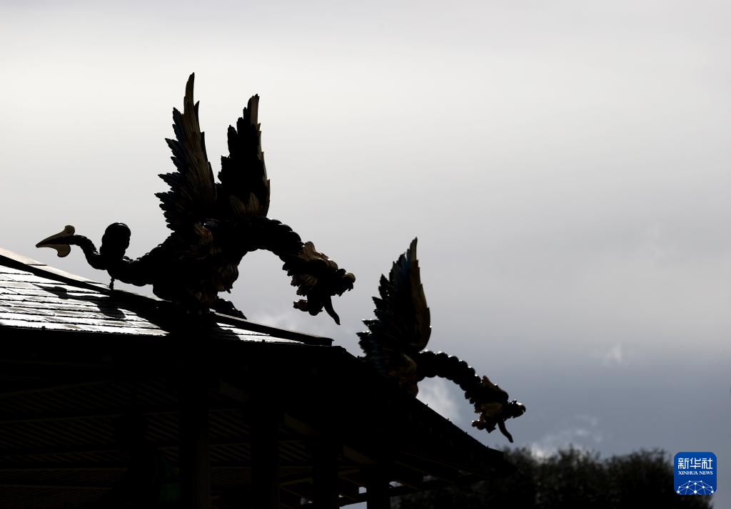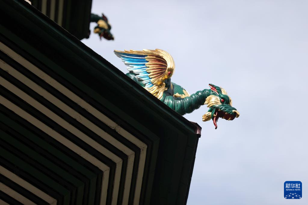 这是3月27日在英国伦敦邱园(英国皇家植物园)拍摄的中式宝塔上的彩色木龙。