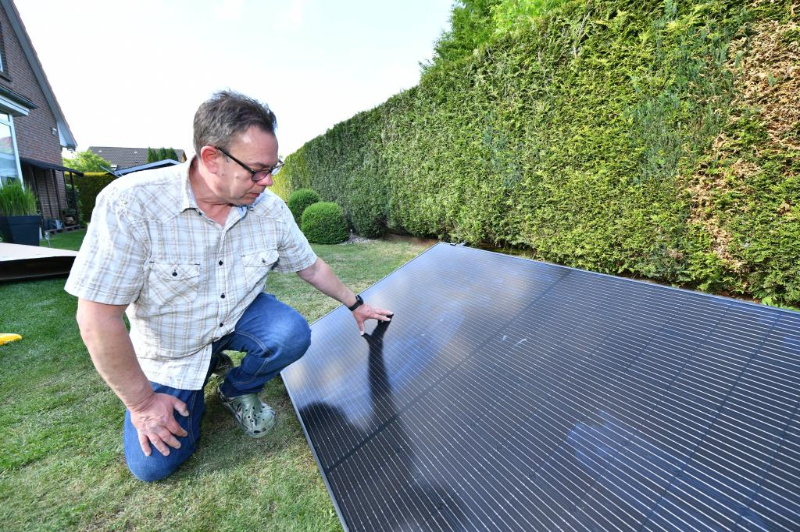 2023年5月30日,在德国施瓦岑贝克小镇,当地居民迪尔克查看家中安装好的中国产太阳能设备。新华社记者任鹏飞摄