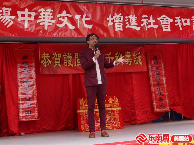 活动上,美国猴屿民俗文化中心董事长张文钦致欢迎词。他说道:“今天猴屿民俗文化中心在这里举办一年一度的文化节暨庆祝侯封境护闽将军千秋华诞活动,此活动已走过15个年头,感谢乡亲朋友们和社区友好协会的帮助和支持,希望大家继续努力、携手并进,让文化节越办越兴旺。”