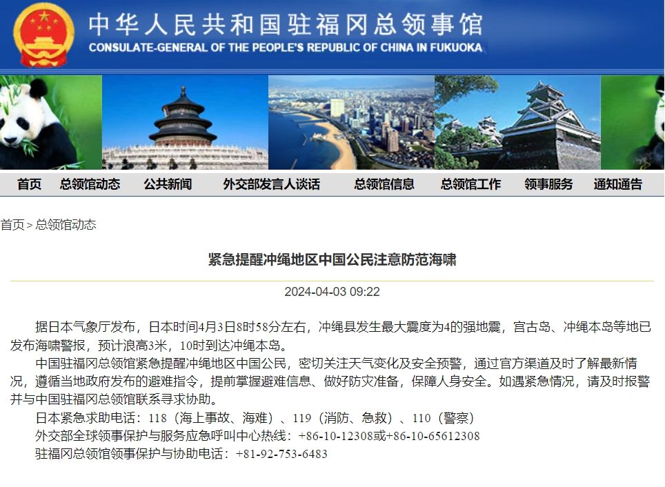 中国驻福冈总领馆紧急提醒冲绳地区中国公民,密切关注天气变化及安全预警,通过官方渠道及时了解最新情况,遵循当地政府发布的避难指令,提前掌握避难信息、做好防灾准备,保障人身安全。如遇紧急情况,请及时报警并与中国驻福冈总领馆联系寻求协助。
