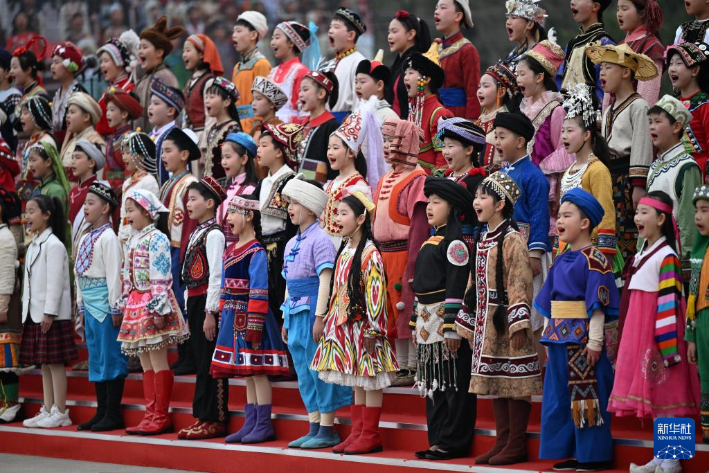 4月4日,身穿民族服饰的儿童在公祭轩辕黄帝典礼上合唱《黄帝颂》。