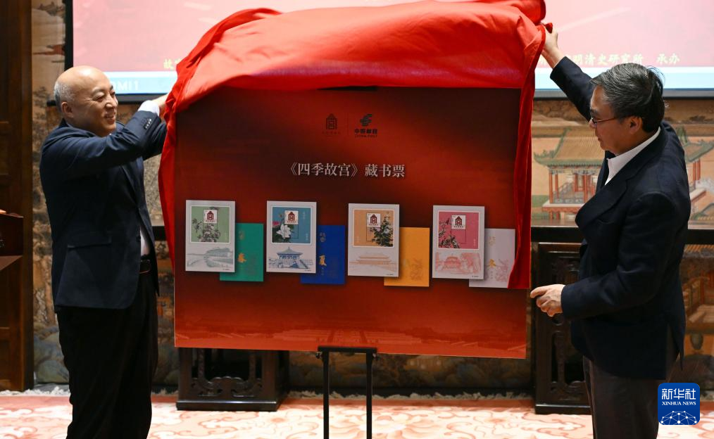 4月7日,故宫博物院院长王旭东(左)、中国邮政集团有限公司党组书记、董事长刘爱力共同为《四季故宫》藏书票揭幕。