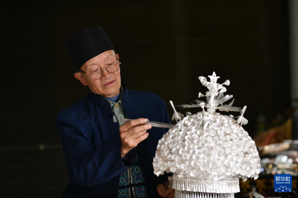 4月8日,在贵州省黄平县,国家级非遗项目苗族银饰制作技艺的代表性传承人杨正贵在自己的工作室中整理一件银帽