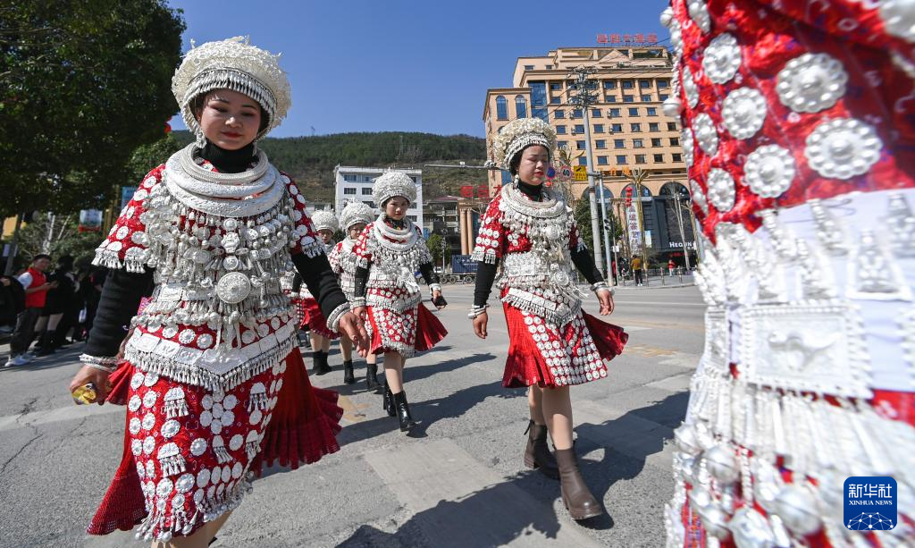 盛装的苗族群众参加贵州省黄平县在农历正月期间举行的巡游活动(2月18日摄)