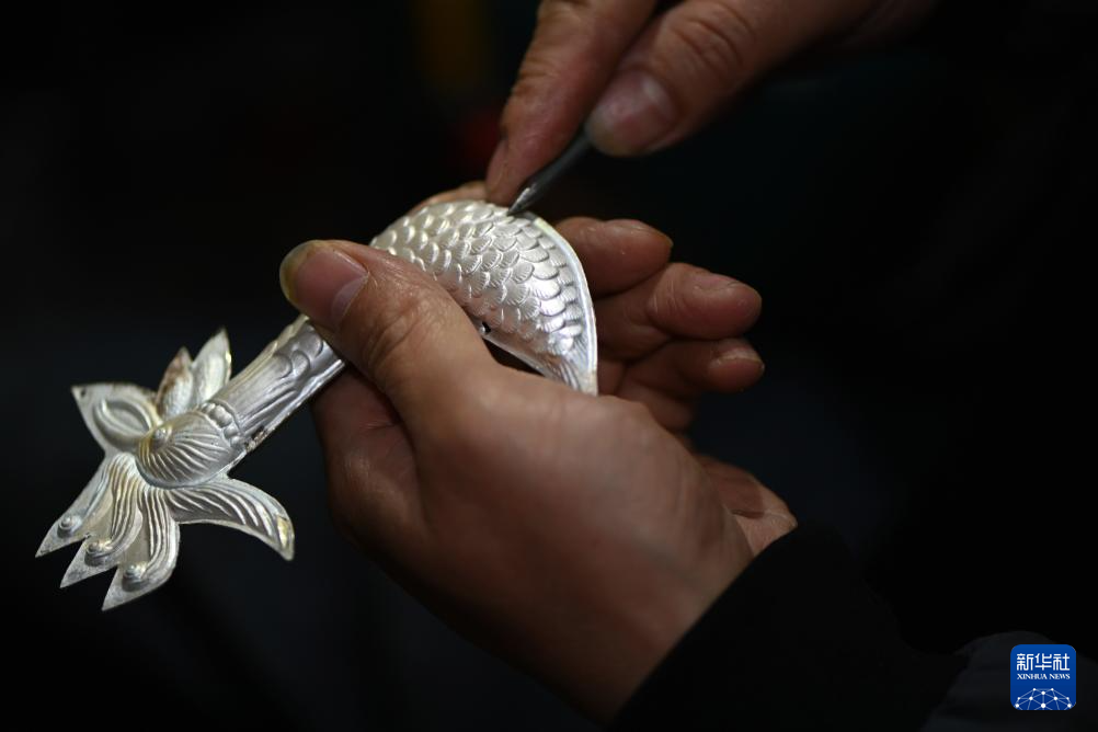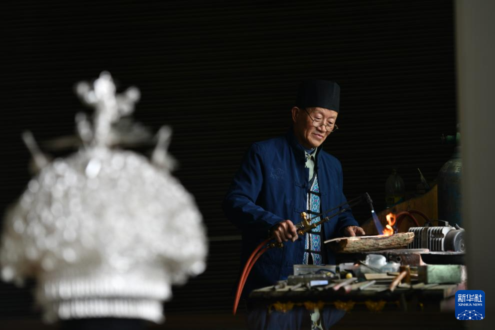 4月8日,在贵州省黄平县,国家级非遗项目苗族银饰制作技艺的代表性传承人杨正贵在自己的工作室中加工银饰