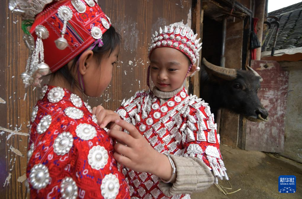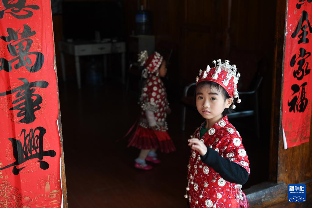 4月8日,盛装的小朋友在贵州省黄平县谷陇镇大寨村玩耍