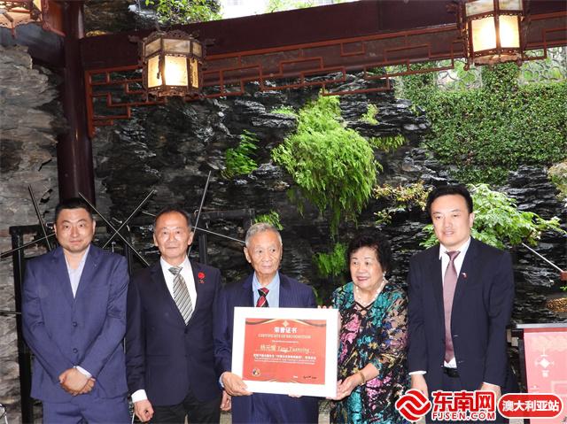 何沈慧霞、田飞向杨元惺颁发“中澳文化特殊贡献奖”荣誉证书