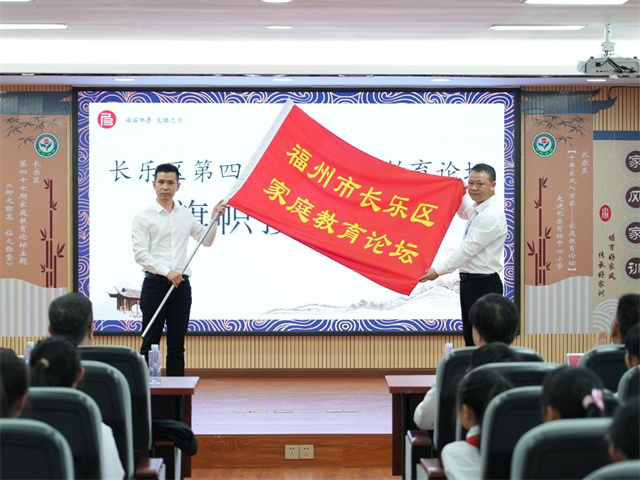论坛最后,福州市长乐区首祉中心小学校长冯玉伟将旗帜授予第四十八期家庭教育论坛的承办方福州市长乐区文岭中心小学书记林太和,接过旗帜,既象征着接过了传承和使命,同时也包含着对中华优秀传统文化的热爱。