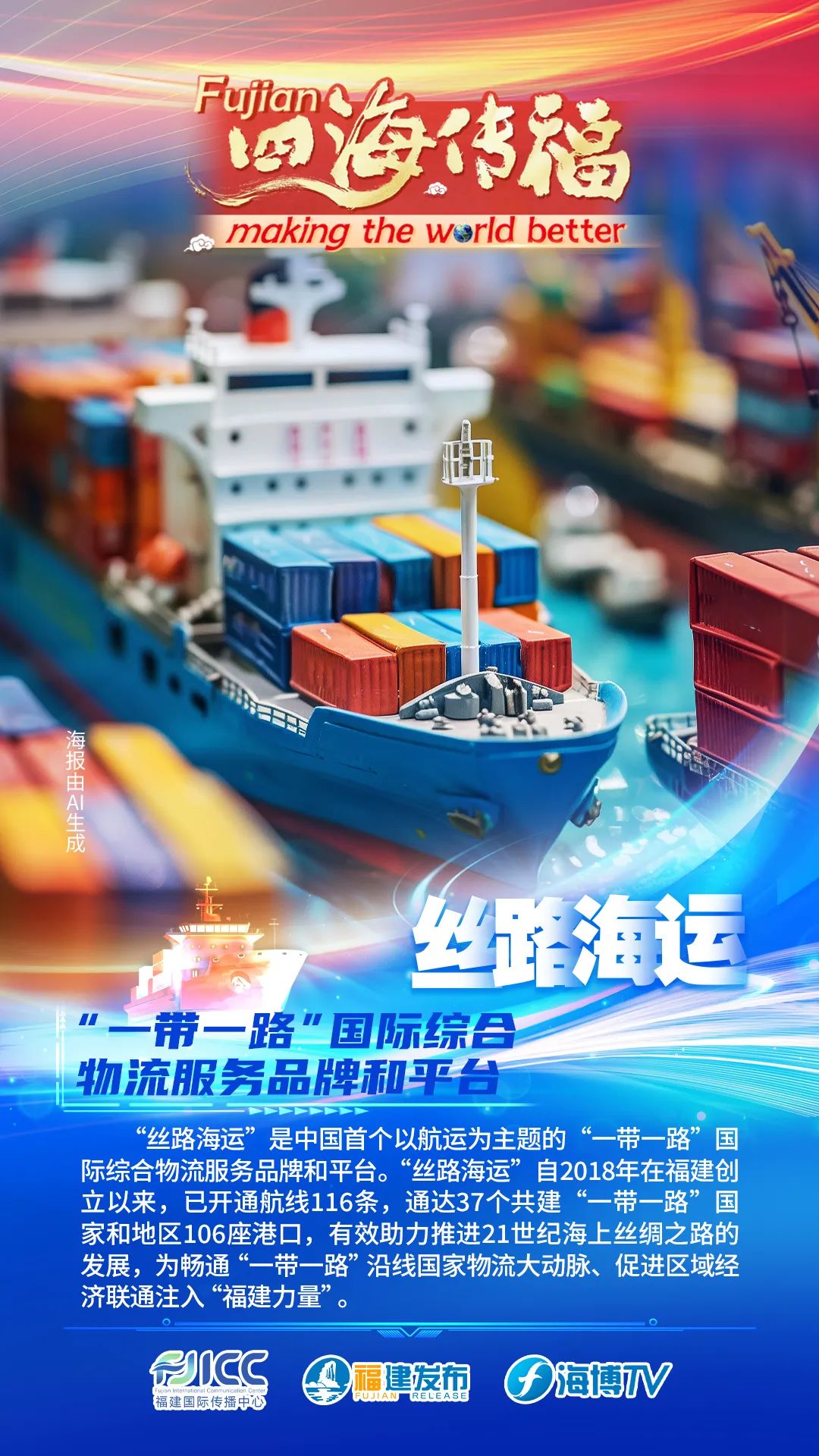 “丝路海运”是中国首个以航运为主题的“一带一路”国际综合物流服务品牌和平台。“丝路海运”自2018年在福建创立以来,已开通航线116条,通达37个共建“一带一路”国家和地区106座港口,有效助力推进21世纪海上丝绸之路的发展,为畅通“一带一路”沿线国家物流大动脉、促进区域经济联通注入“福建力量”。
