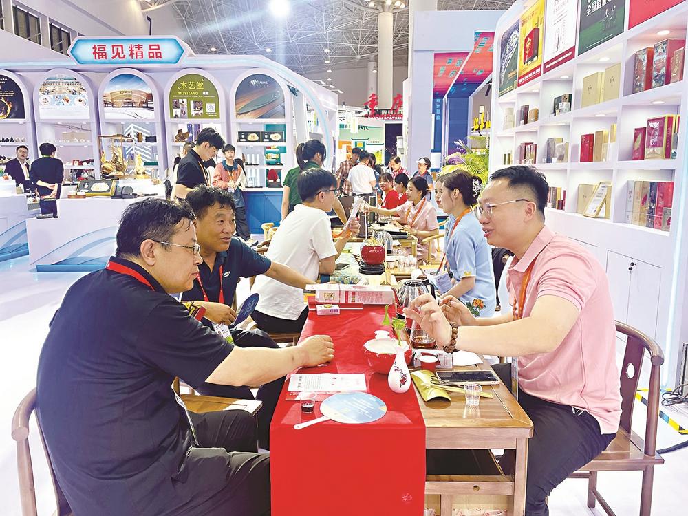 福建人爱喝茶,也爱请人喝茶。福建馆内茶香四溢,武夷星、八马、正山堂、香江茶业、大宇茶业等知名茶企的茶桌一字排开,座无虚席。