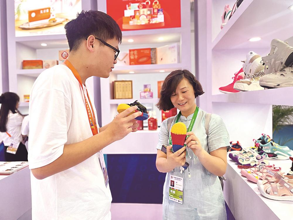 “莆田鞋”亮相消博会,来自湖北的顾客王莉(右)直呼“性价比太高了”