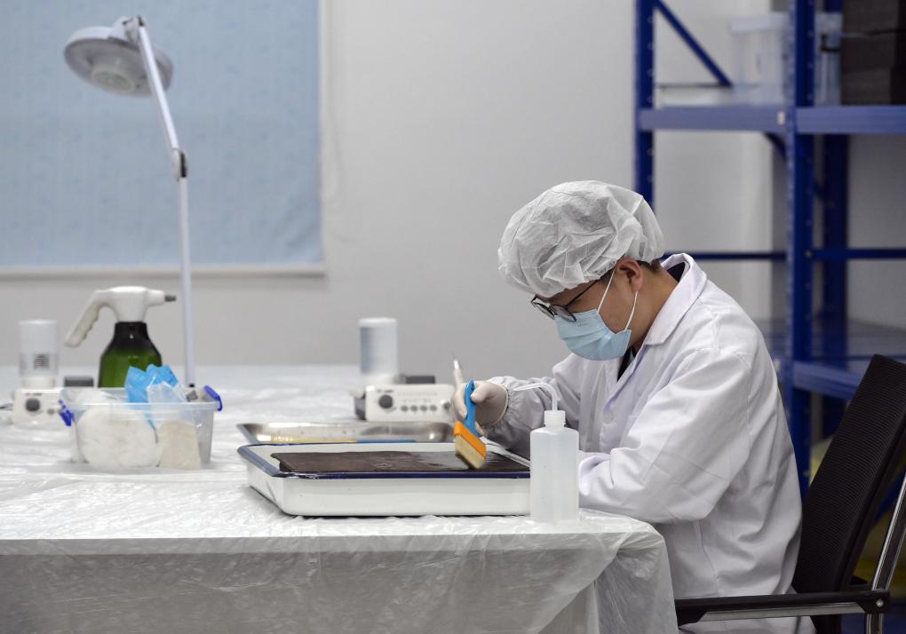 4月16日,考古工作者在武王墩考古实验室无机质保护室内进行青铜器保护工作。新华社记者 李贺 摄