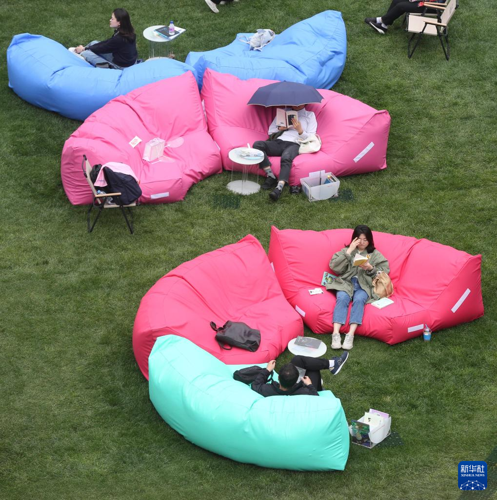 4月21日,市民在韩国首尔广场的露天图书馆读书、休闲。